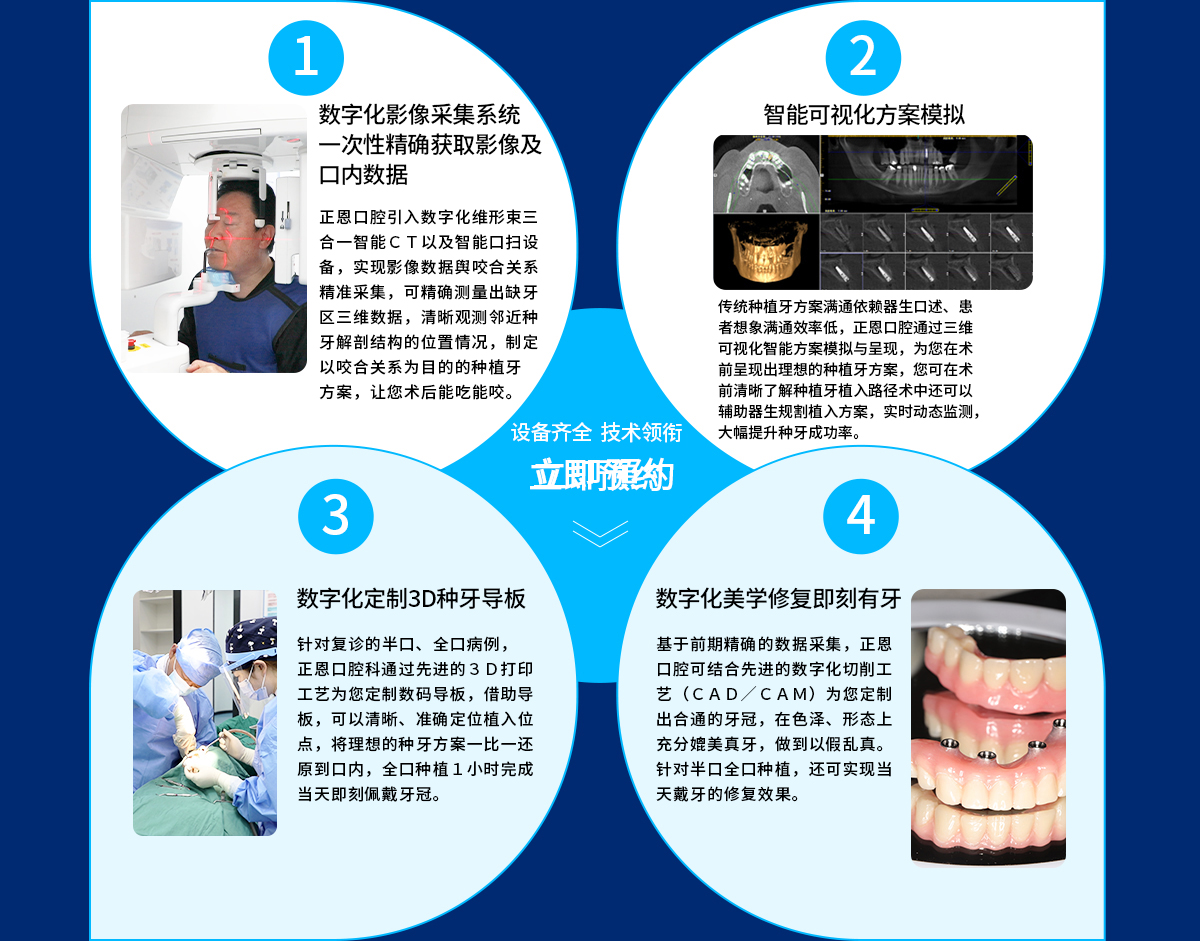 正恩口腔数字化精準种植牙技术,通过数位化精确建模、CBCT 数据提取、口内 CT 扫描、数位化精确分析与模拟、数位化手术导板、3D 模型列印、义齿加工及手术模 拟导航等,实现全数字化科技在口腔诊疗中的运用,有效突破传统种植牙的弊端,精、准、稳、快地植入种植体,微创微痛,即拔即种,创口微小,术后能进食,是目前非常先进的种植牙技术。